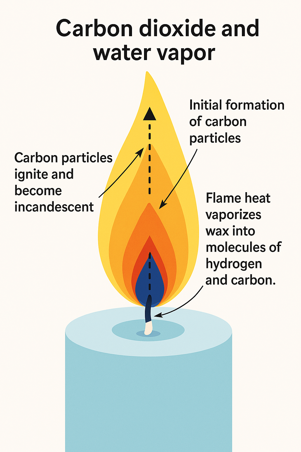 If you look closely at a candle flame, you’ll see a blue area at the base of the flame. Above that is a small dark orange-brown section, and above that is the large yellow region that we associate with candle flames.