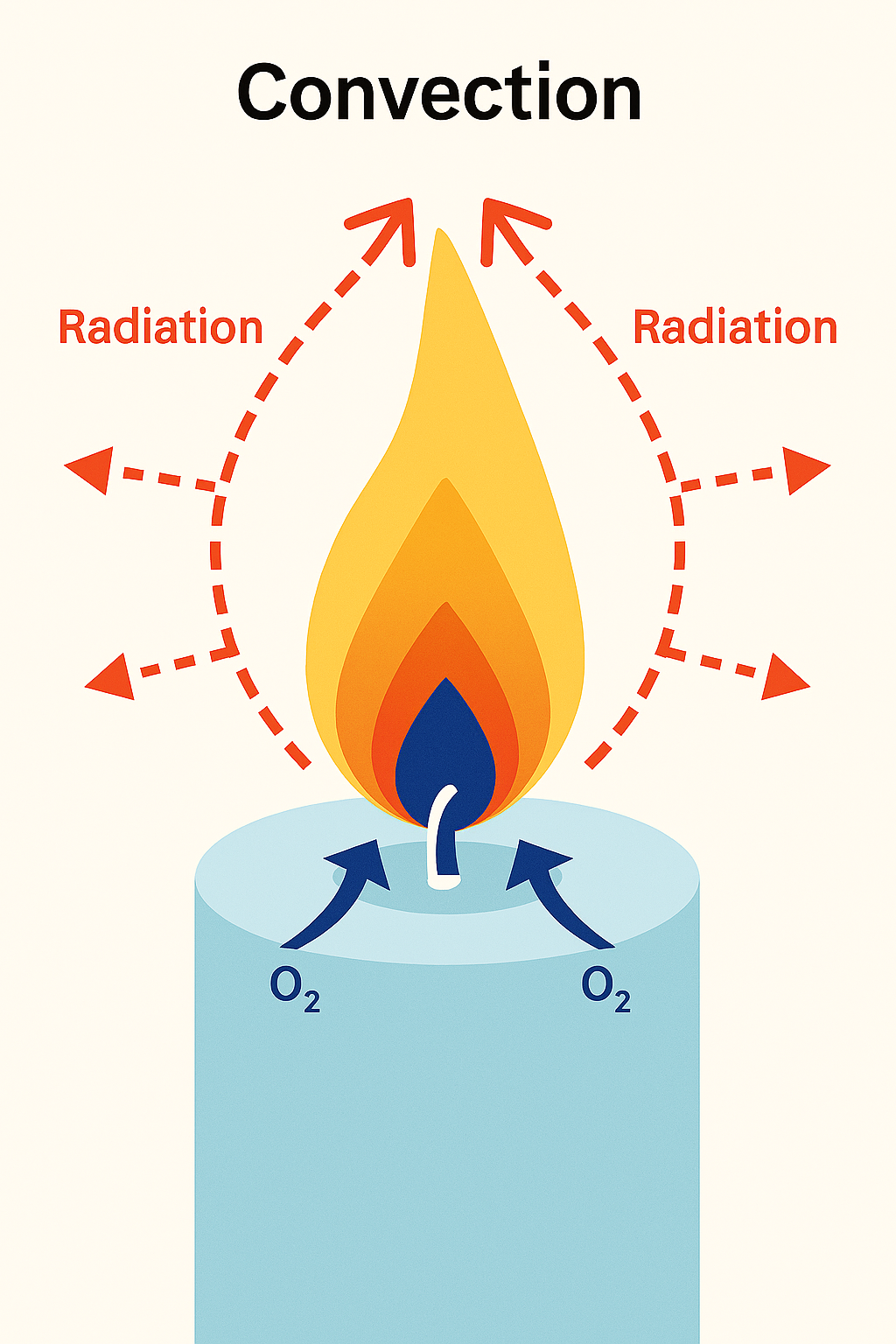 This creates a continual cycle of upward moving air around the flame (a convection current), which gives the flame its elongated or teardrop shape.